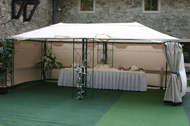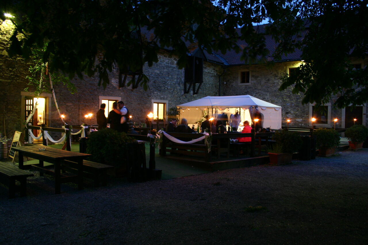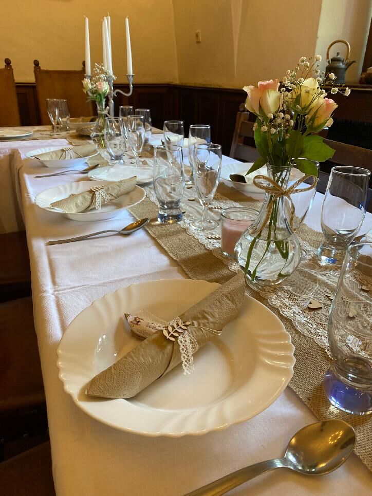 - přivítaní svatebčanů pohárkem dobrého vína, sektem nebo pravou domácí slivovicí, po obřadu společné zametání střepů před prahem naší restaurace, než je nevěsta ženichem přenesena přes práh do prostor naší restaurace jež se nachází ve starobylých prostorách bývalé hradní konírny.